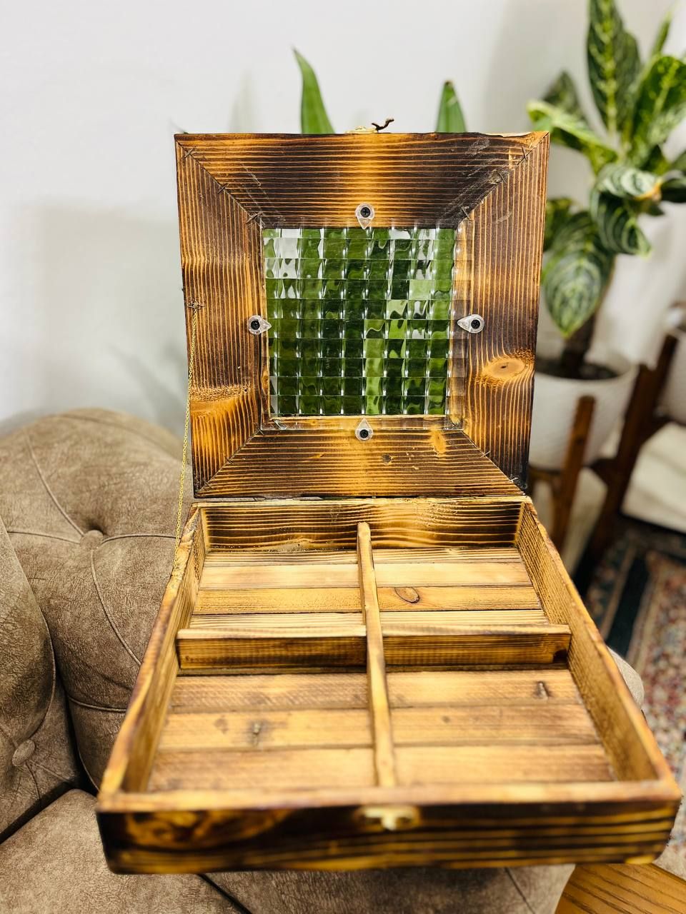 باکس پذیرایی مستطیل با شیشه سنتی مربعی کیفیت عالی محکم کاری شده توسط چسب چوب و میخ و منگنه روغن جلا خورده سوخته شده مقرون به صرفه سایز حدودا ۳۰ در ۳۰